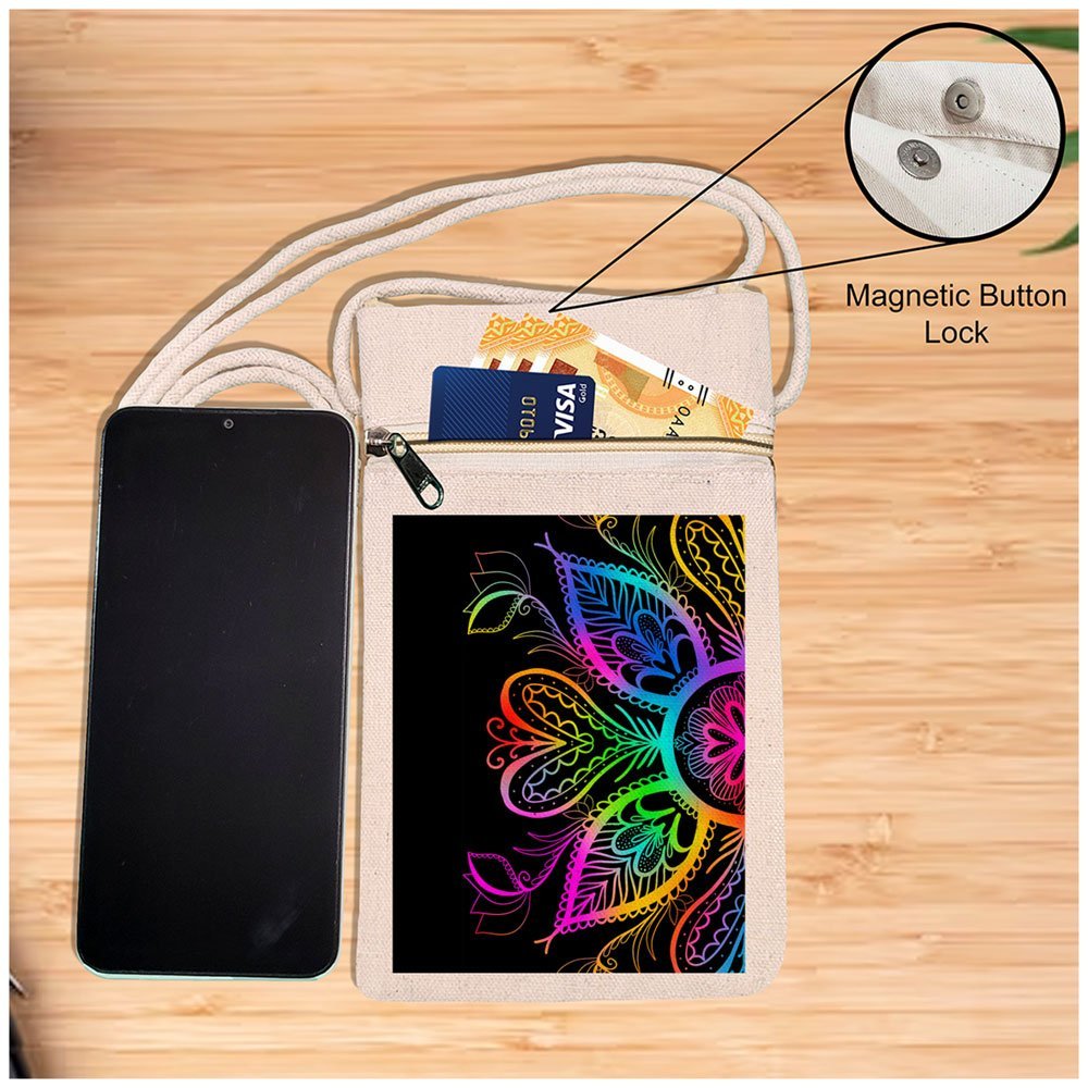 This sleek mobile sling bag is designed to keep your smartphone and daily essentials secure and within easy reach. With dimensions of 20 cm x 12 cm x 1 cm, it fits any smartphone comfortably. The main pocket, lined with a scratch-resistant inner layer, ensures your phone stays protected, while a magnetic button lock keeps it secure. A front pocket with a zipper is perfect for carrying cash, cards, keys, and other small items. Made from tough, durable recycled cotton canvas, this bag is built to last. Plus, the stunning printed designs make this sling bag a stylish and practical choice for any occasion.
