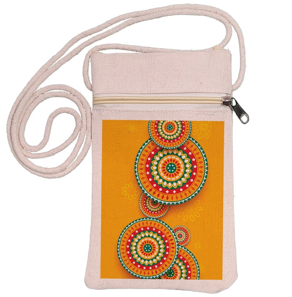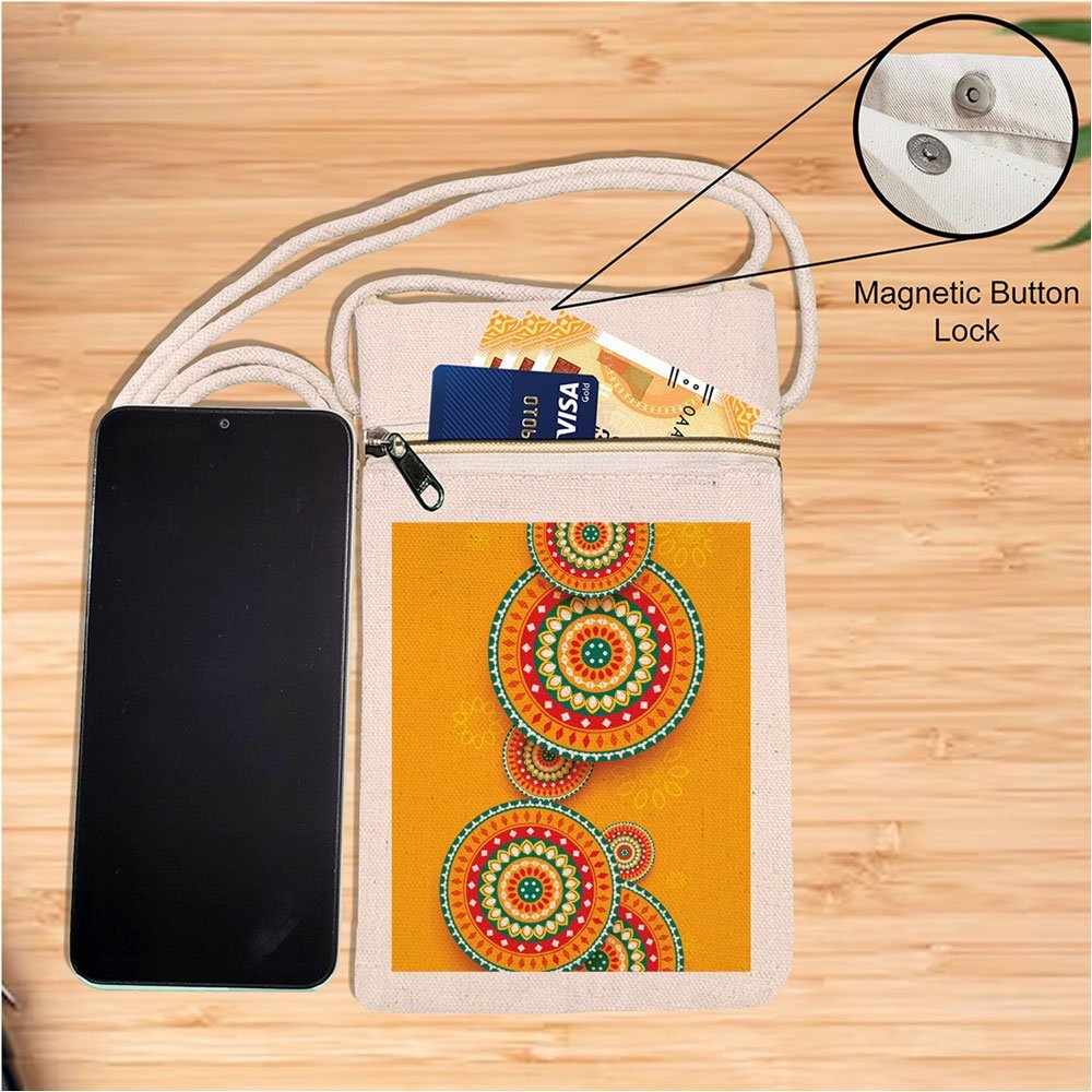 This sleek mobile sling bag is designed to keep your smartphone and daily essentials secure and within easy reach. With dimensions of 20 cm x 12 cm x 1 cm, it fits any smartphone comfortably. The main pocket, lined with a scratch-resistant inner layer, ensures your phone stays protected, while a magnetic button lock keeps it secure. A front pocket with a zipper is perfect for carrying cash, cards, keys, and other small items. Made from tough, durable recycled cotton canvas, this bag is built to last. Plus, the stunning printed designs make this sling bag a stylish and practical choice for any occasion.