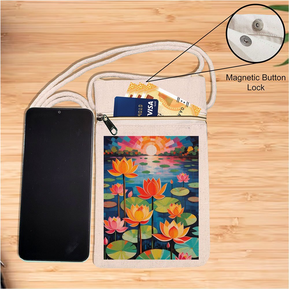 This sleek mobile sling bag is designed to keep your smartphone and daily essentials secure and within easy reach. With dimensions of 20 cm x 12 cm x 1 cm, it fits any smartphone comfortably. The main pocket, lined with a scratch-resistant inner layer, ensures your phone stays protected, while a magnetic button lock keeps it secure. A front pocket with a zipper is perfect for carrying cash, cards, keys, and other small items. Made from tough, durable recycled cotton canvas, this bag is built to last. Plus, the stunning printed designs make this sling bag a stylish and practical choice for any occasion.