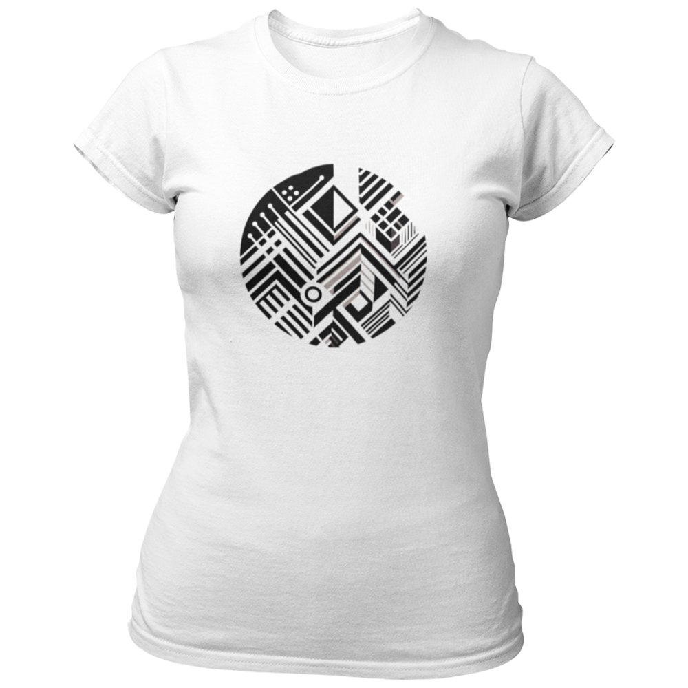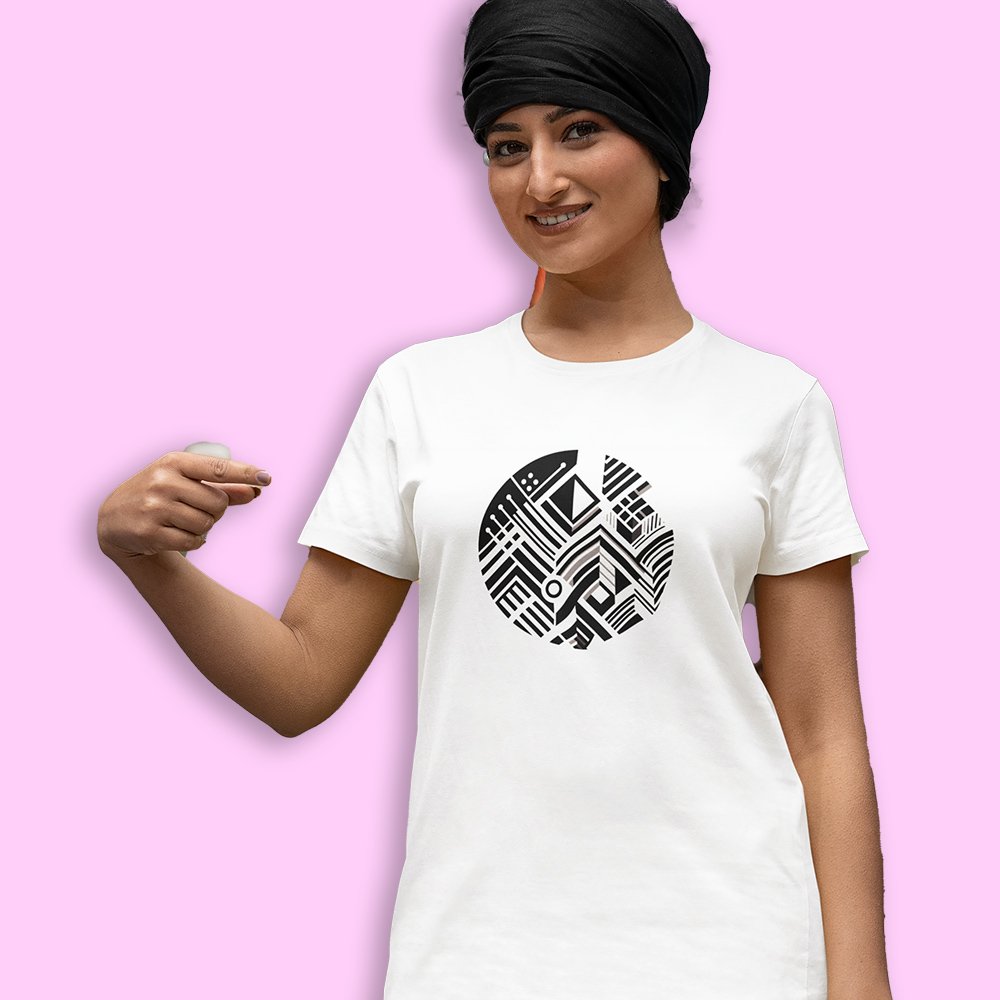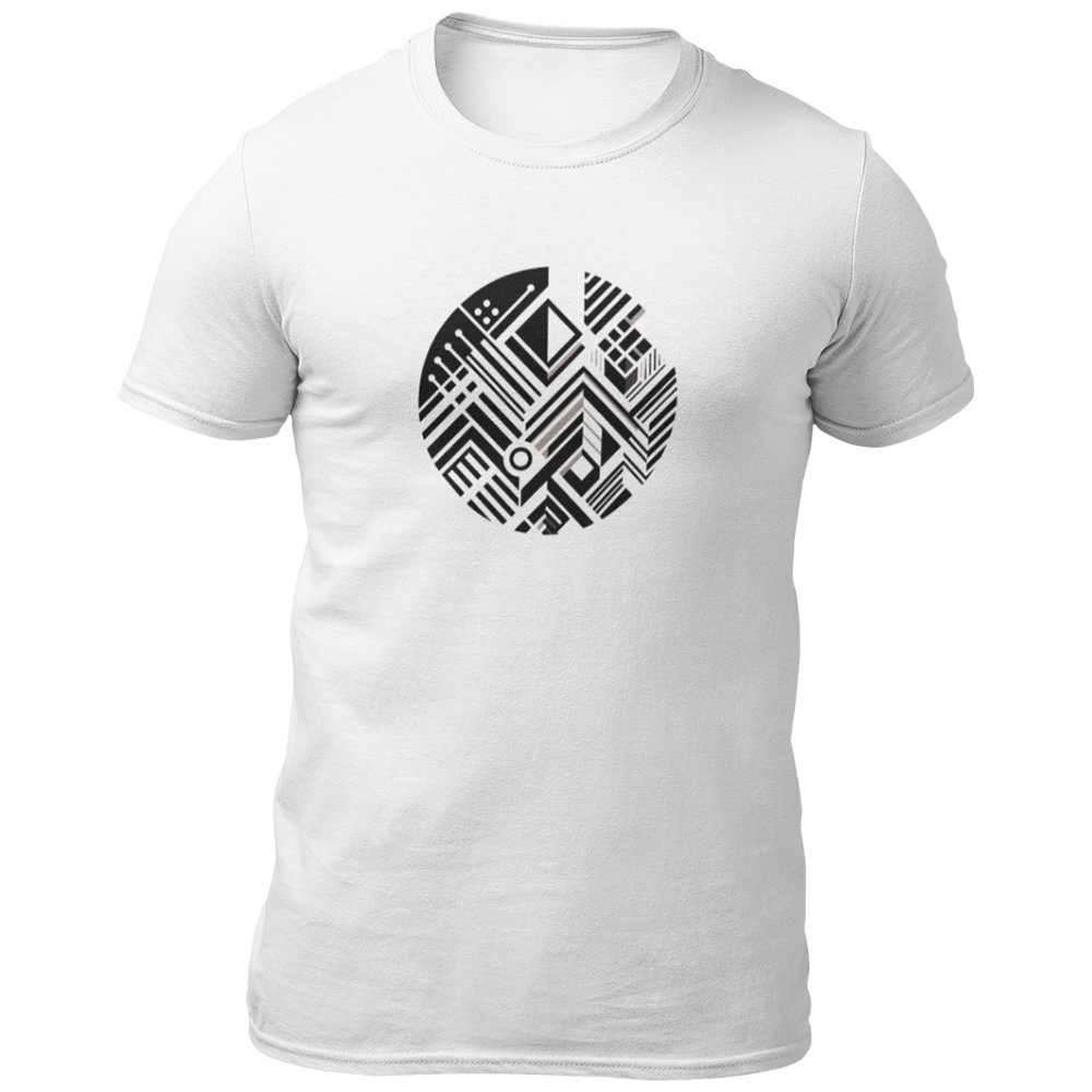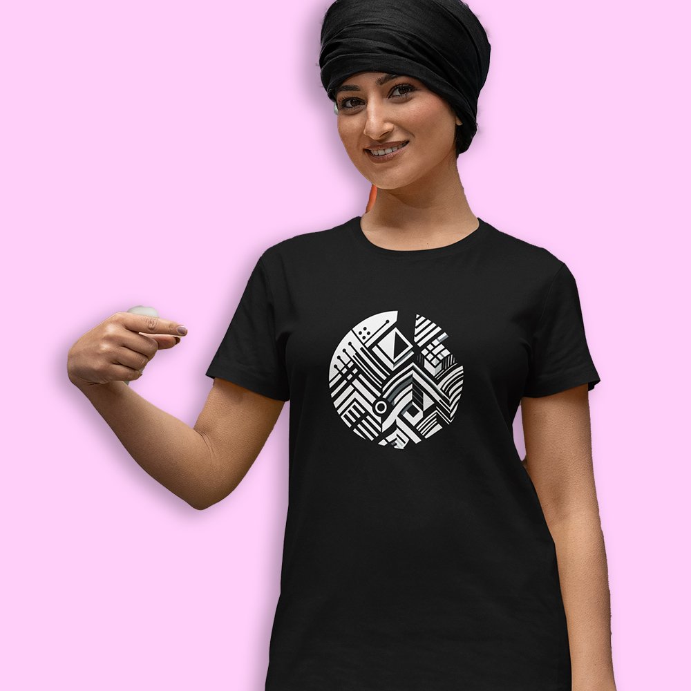 This striking design features a round shape composed of bold black and white geometric elements. The interplay of clean lines and shapes creates a visually dynamic piece, perfect for those who appreciate modern, minimalist aesthetics.