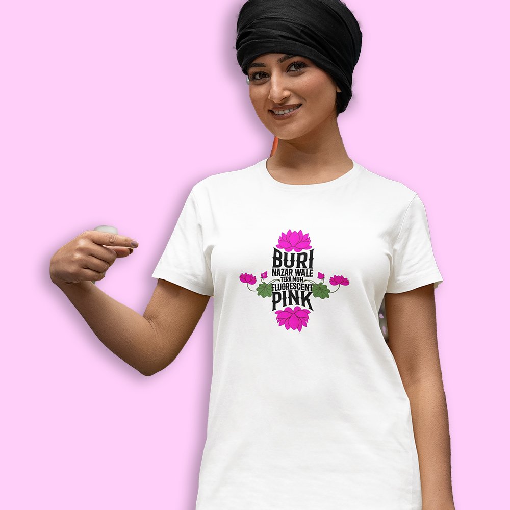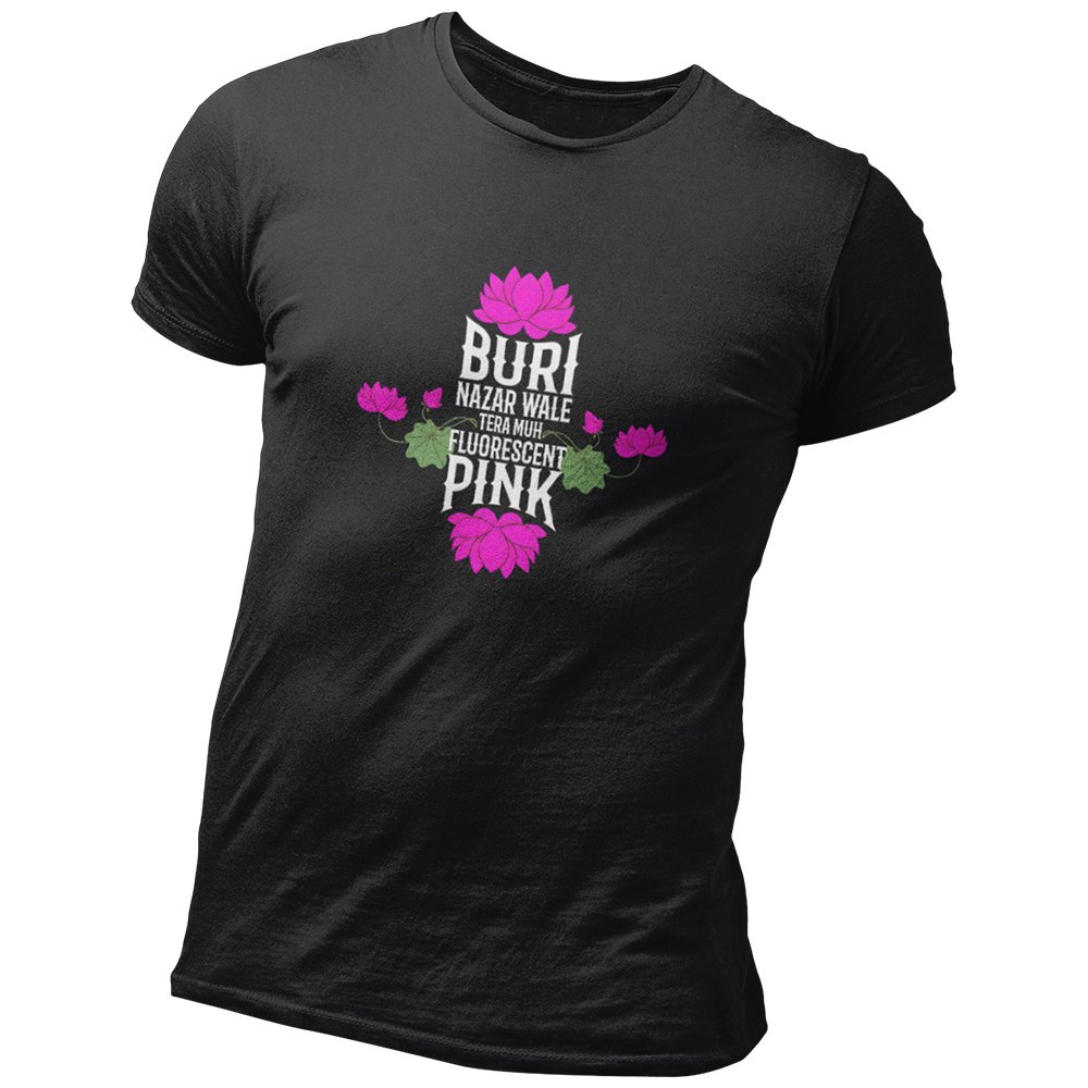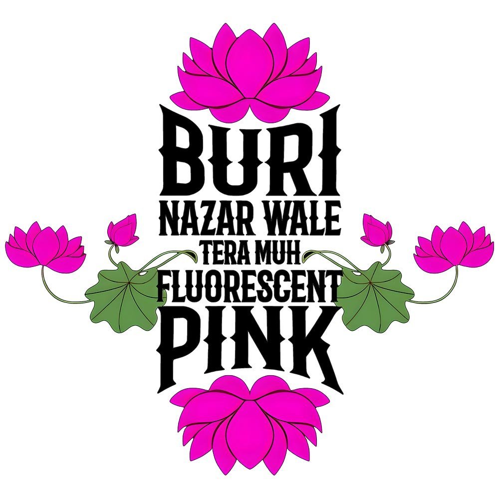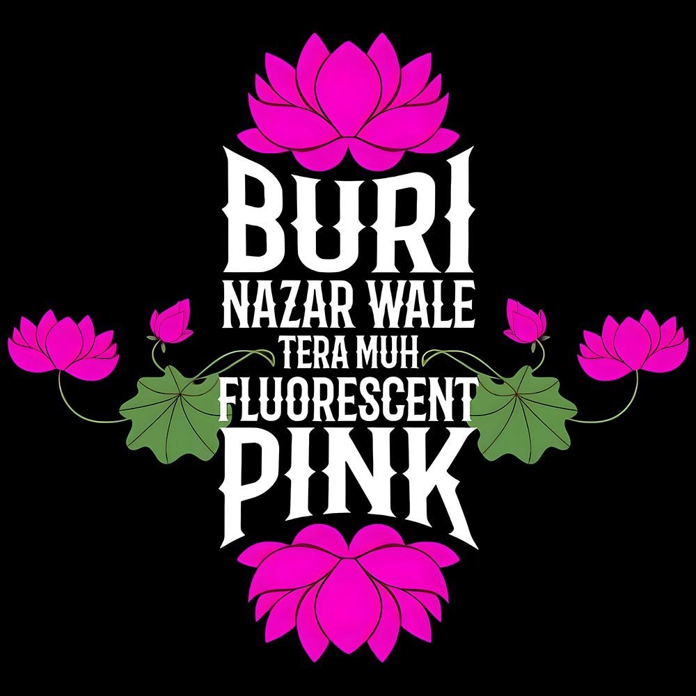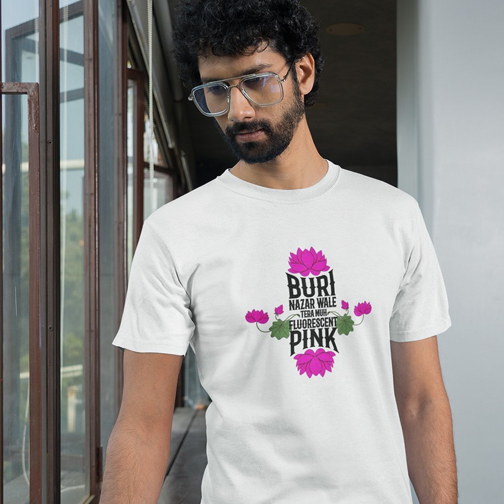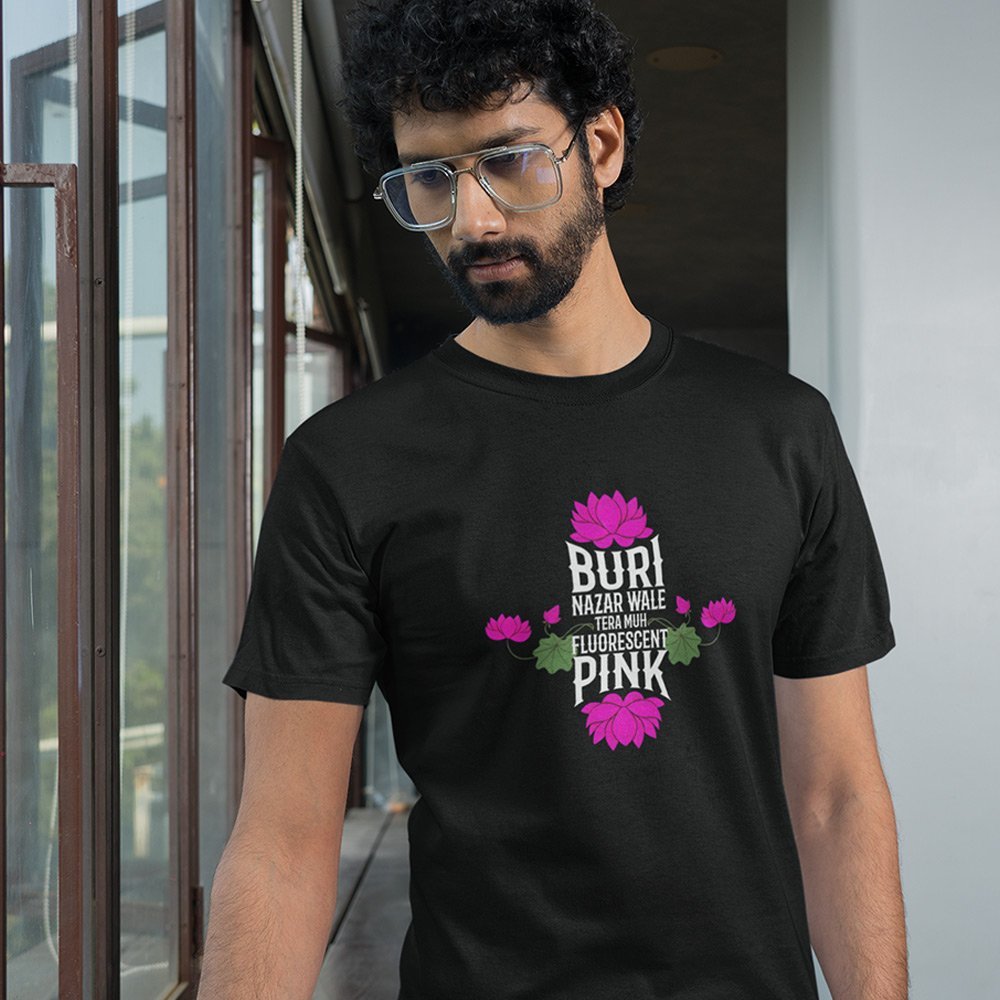 Ward off the evil eye with this vibrant ‘Buri Nazar Wale Tera Muh Fluorescent Pink’ T-shirt. Adorned with beautiful lotus flowers, it’s both protective and eye-catching. Great for making a statement.
