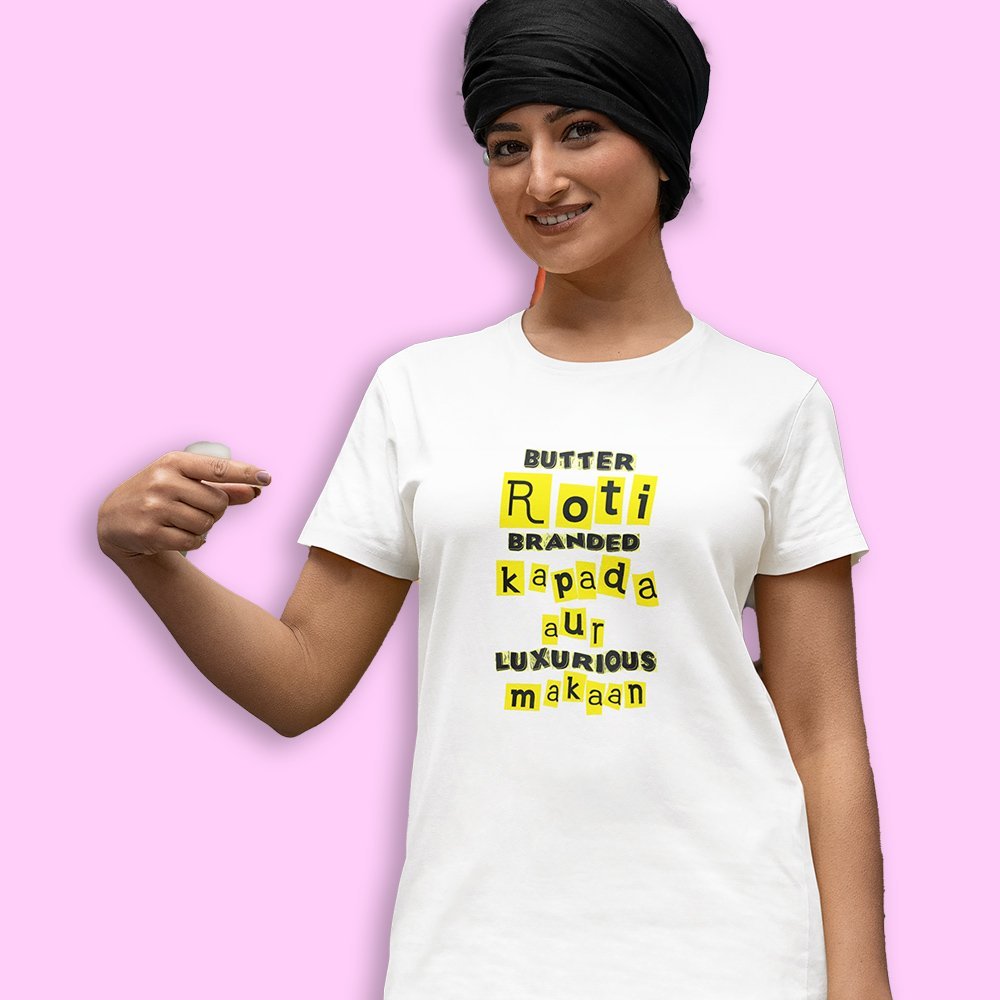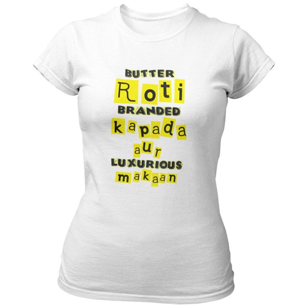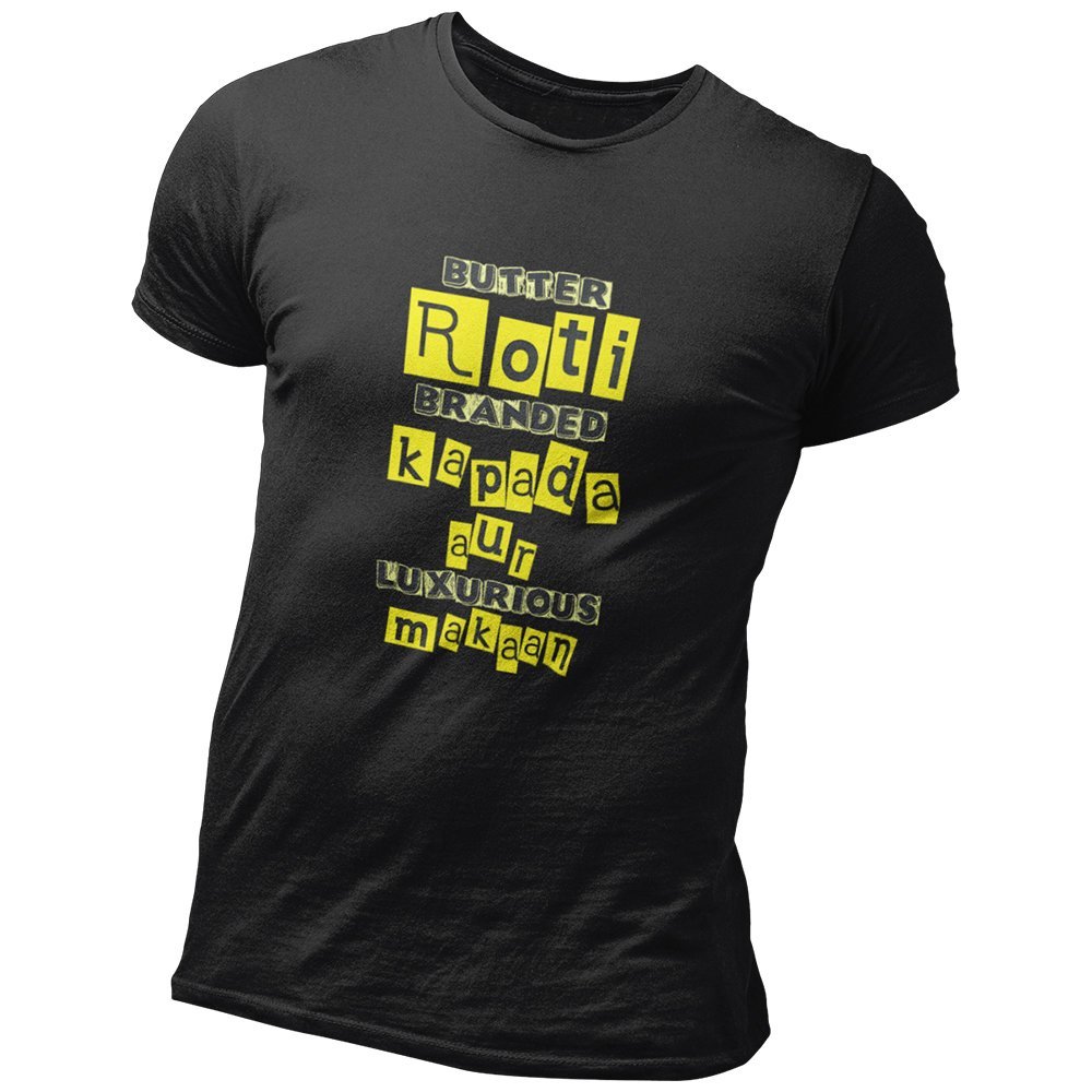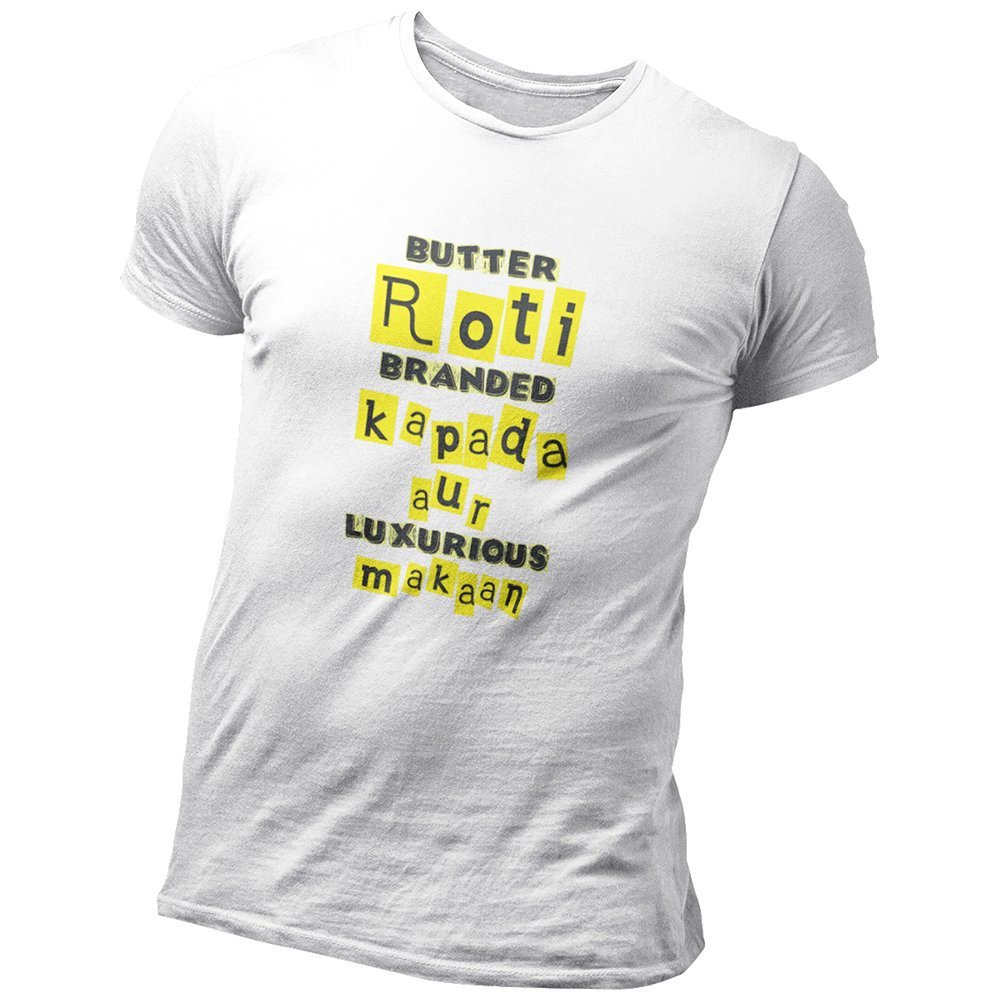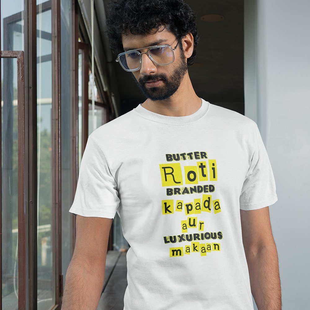 Show off your humor with this ‘Butter Roti Branded Kapada Aur Luxurious Makaan’ T-shirt. Designed with playful cut-out letters, it mocks luxury with a touch of everyday reality. Great for those with a witty sense of style.