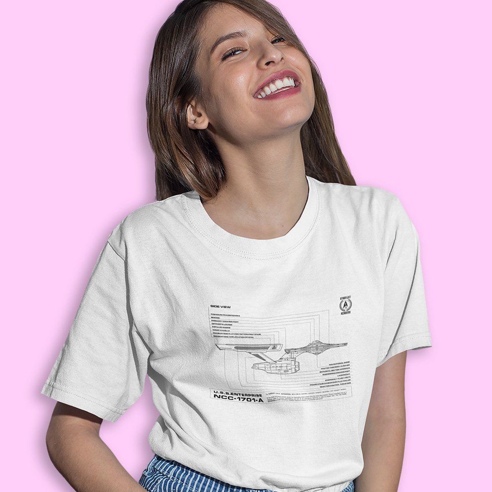 This design features a detailed side view of the legendary starship Enterprise 1701-A, presented as an engineering drawing. The clean lines and technical precision offer a tribute to the starship that became an icon in space exploration and science fiction. Perfect for Star Trek enthusiasts who appreciate the elegance of starship design.