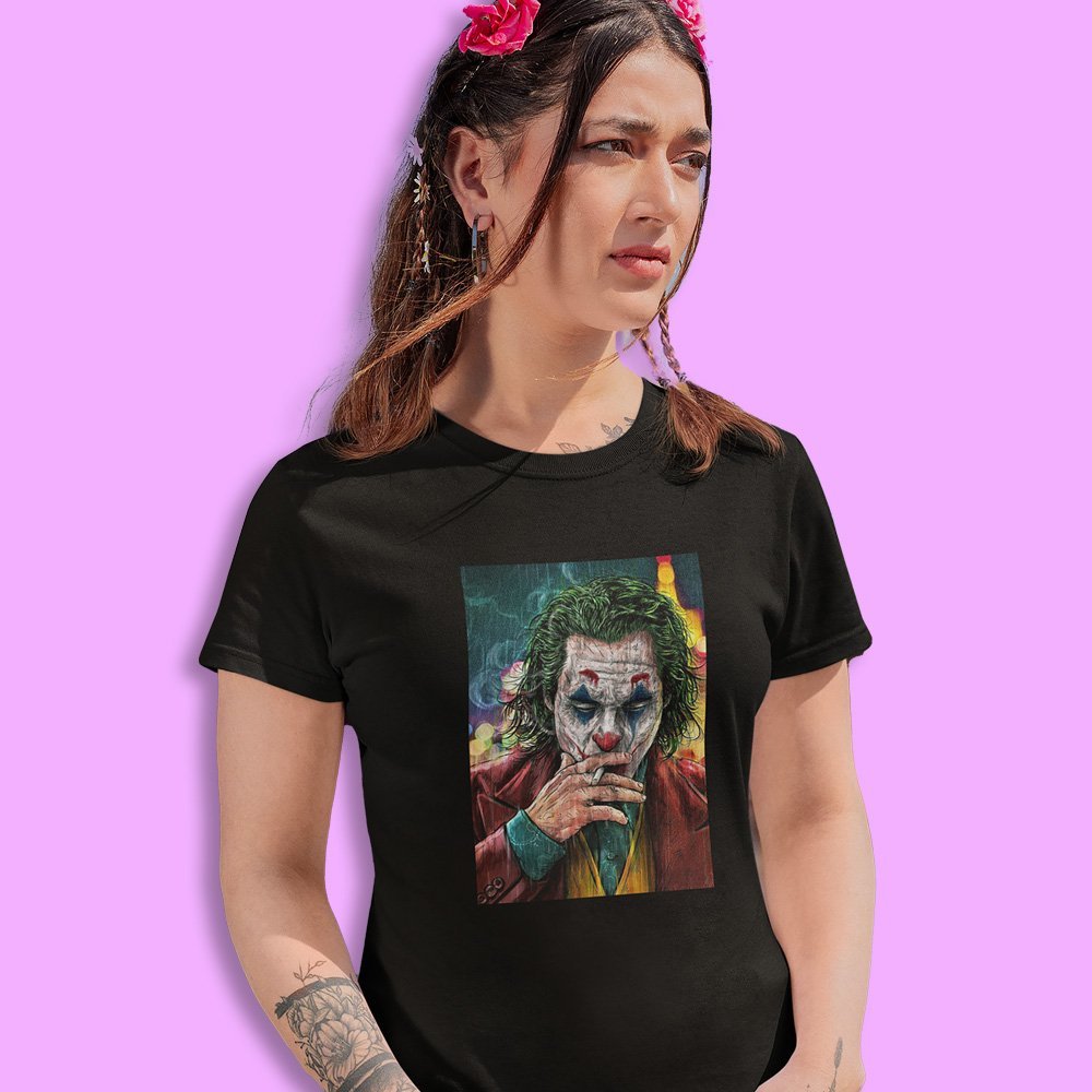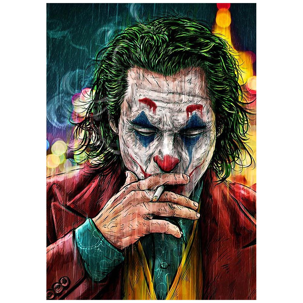 This bold and colorful design features a striking portrayal of the Joker, depicted in an oil painting style. The infamous DC villain is seen smoking a cigarette, with vivid brushstrokes and dramatic colors capturing his chaotic and menacing personality. The artistic rendition brings out the dark, yet vibrant, nature of this iconic character.